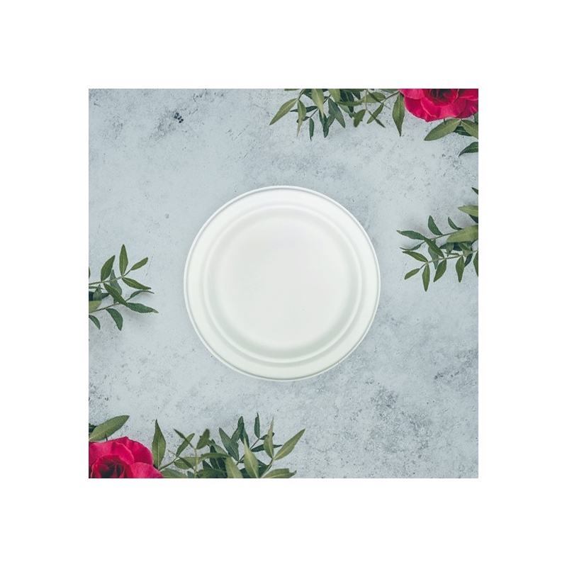 Talerze okrągłe z trzciny cukrowej o średnicy 18 cm, pakowane po 10, 25, 50 lub 100 sztuk.