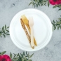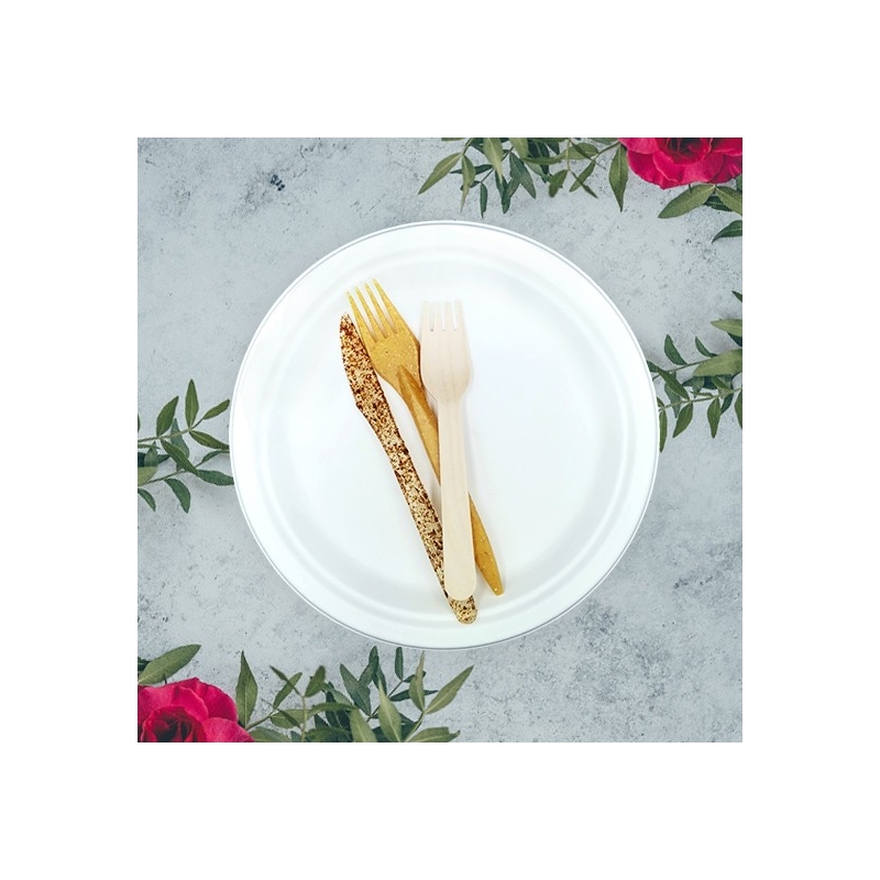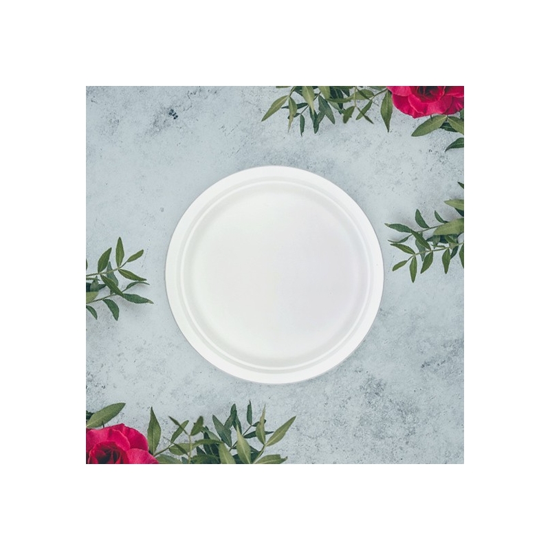 Talerze okrągłe z trzciny cukrowej o średnicy 23 cm, pakowane po 10, 25, 50 lub 100 sztuk.