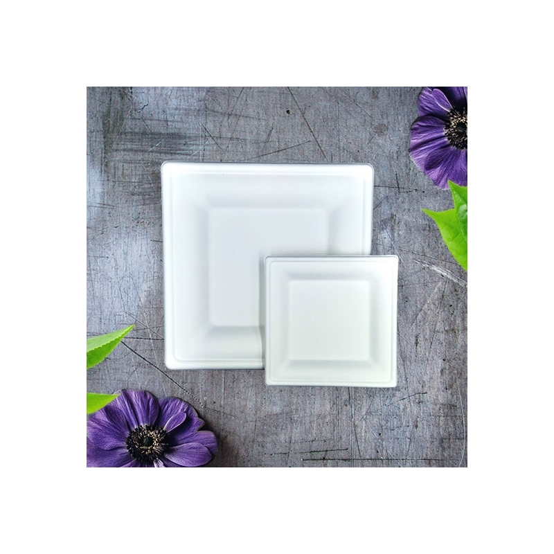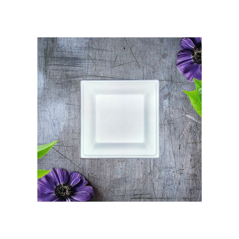 Talerze kwadratowe z trzciny cukrowej o wymiarach 15.5x15.5 cm, pakowane po 10, 25, 50 lub 100 sztuk.